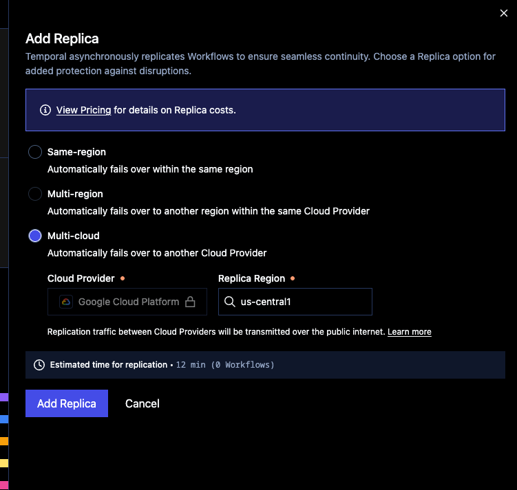 1. Add a Namespace replica in the region you want to migrate to. See regions for a list of available regions and supported multi-region and multi-cloud configurations.